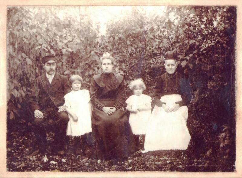 Pildil Valgejõe viimane kõrtsmik Jaska Viikman koos naise Emilie, ema Maali ning tütarde Salme ja Leidaga. Foto ca 1898. aastast. Vallaline Jaska oli 1888. aastal tulnud Valgejõele kõrtsmikuks emaga kahekesi.